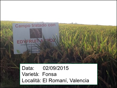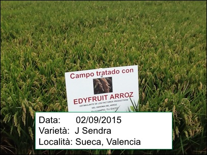 Il campo di riso Albufera trattato con ROOT RICE, EDYFRUIT ARROZ e PODIUM ARROZ. Il coltivatore dice che molte persone di vedere l´aspetto della trama sono stati interessati, e che la sua evoluzione è stata molto buona dall´inizio. Si è controllato molto bene il problema di Pyricularia e crede che la parcella darà una buona raccolta.
