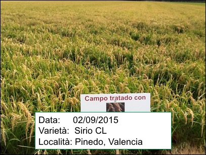 Parcella di riso Sirio CL trattata con ROOT RICE e EDYFRUIT ARROZ. Il proprietario del campo ci dice che lei ha trama "molto pulita" e sana; che le applicazioni di EDYFRUIT ARROZ ha reso che le piante sono più forti.