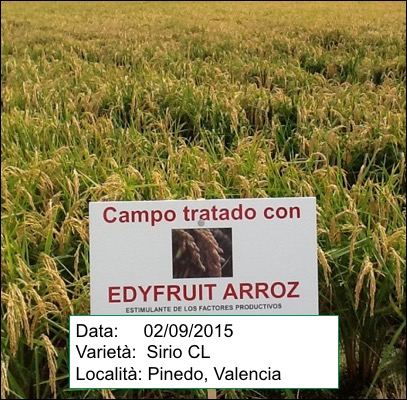 Parcella con riso de varietà Sirio CL trattato con ROOT RICE, EDYFRUIT ARROZ e COUPE REGENERACIÓN Plus. Era una parcella con problema del terreno. Dalle prime applicazioni di ROOT RICE e COUPE REGENERACIÓN Plus cominciare a vedere i miglioramenti e la successiva applicazione di EDYFRUIT ARROZ, la parcella ha un aspetto migliore rispetto al testimone. Le spighe hanno una buona densità e buona lunghezza.